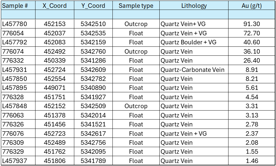 The reported rock samples are selective grab samples (from outcrop and/or float) and are not necessarily representative of mineralization on the property. The presence of visible gold in certain samples is qualitative in nature and does not indicate the grade distribution of mineralization. A total of 292 rock samples were collected during the entire traversing program across all areas. Table 1 lists the 16 samples collected within the newly identified mineralised trend that returned > 1g/t Au.